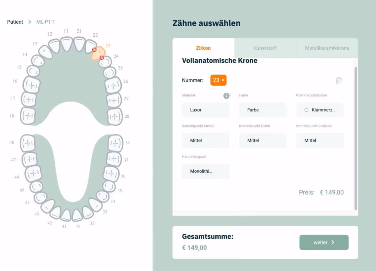 Wählen Sie den Zahn direkt auf der interaktiven Zahnkarte. Material, Farbe nach Luxor-Skala und Kontaktpunkte werden konfiguriert und anschließend der Preis sofort live angezeigt.